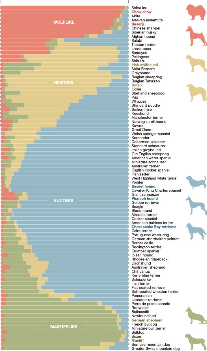 startling genetic similarities between all of the breeds. In total, there are four main groups of dogs, the wolflike, the herder, the hunter and the mastifflike. Most modern breeds are a little bit of each of these four major types, and the infographic below will show you where your dog lies on the scale.